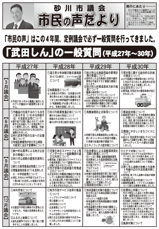 3月議会の会期は平成31年3月4日(月)~3月12日(火)の 9日間の予定です。私自身は通常どおり一般質問を予定しています。
