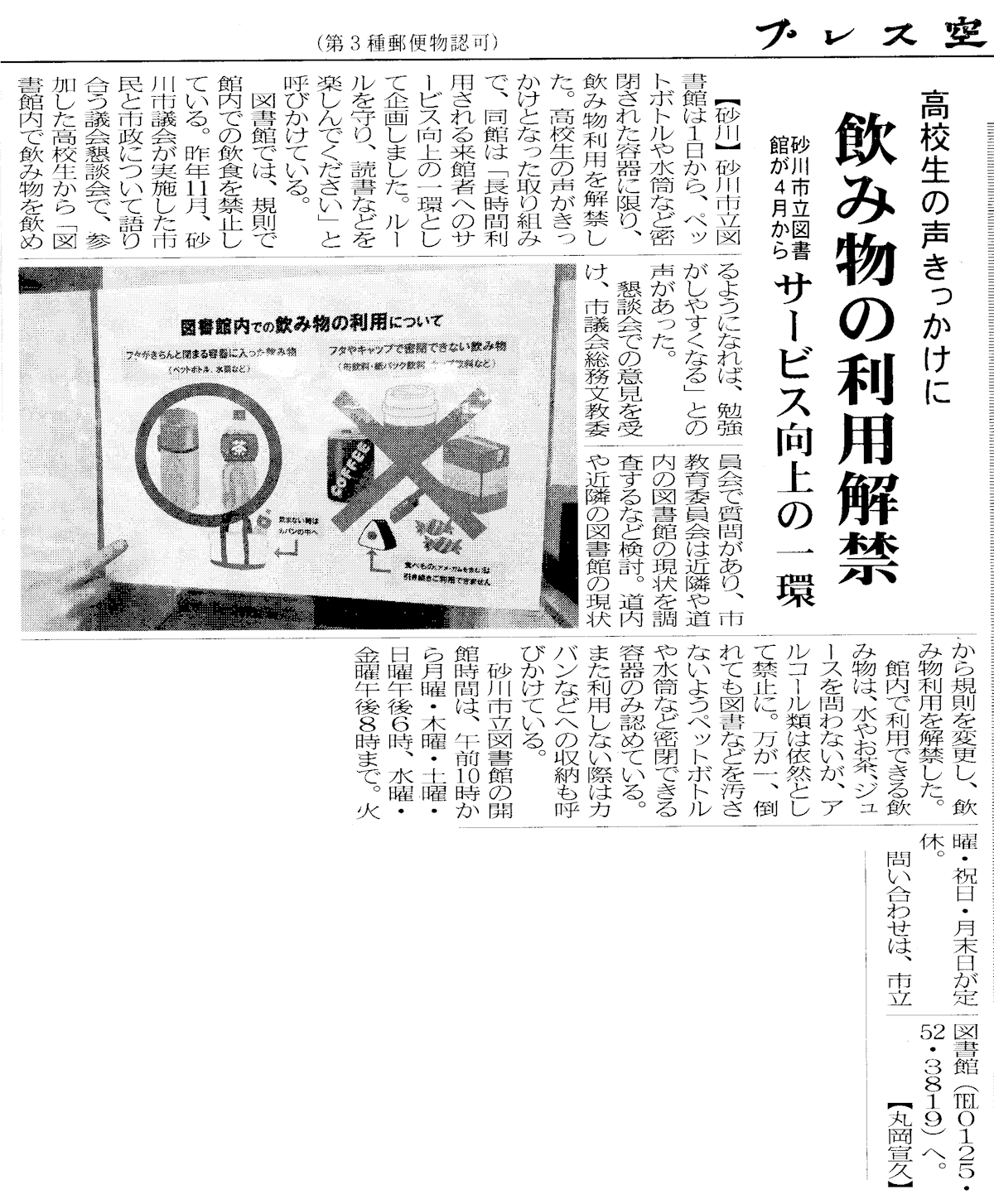 きっかけは、昨年11月に開催された議会懇談会。その場に参加してくれた高校生から「図書館で飲料が利用できないのは不便」との意見をいただきました。