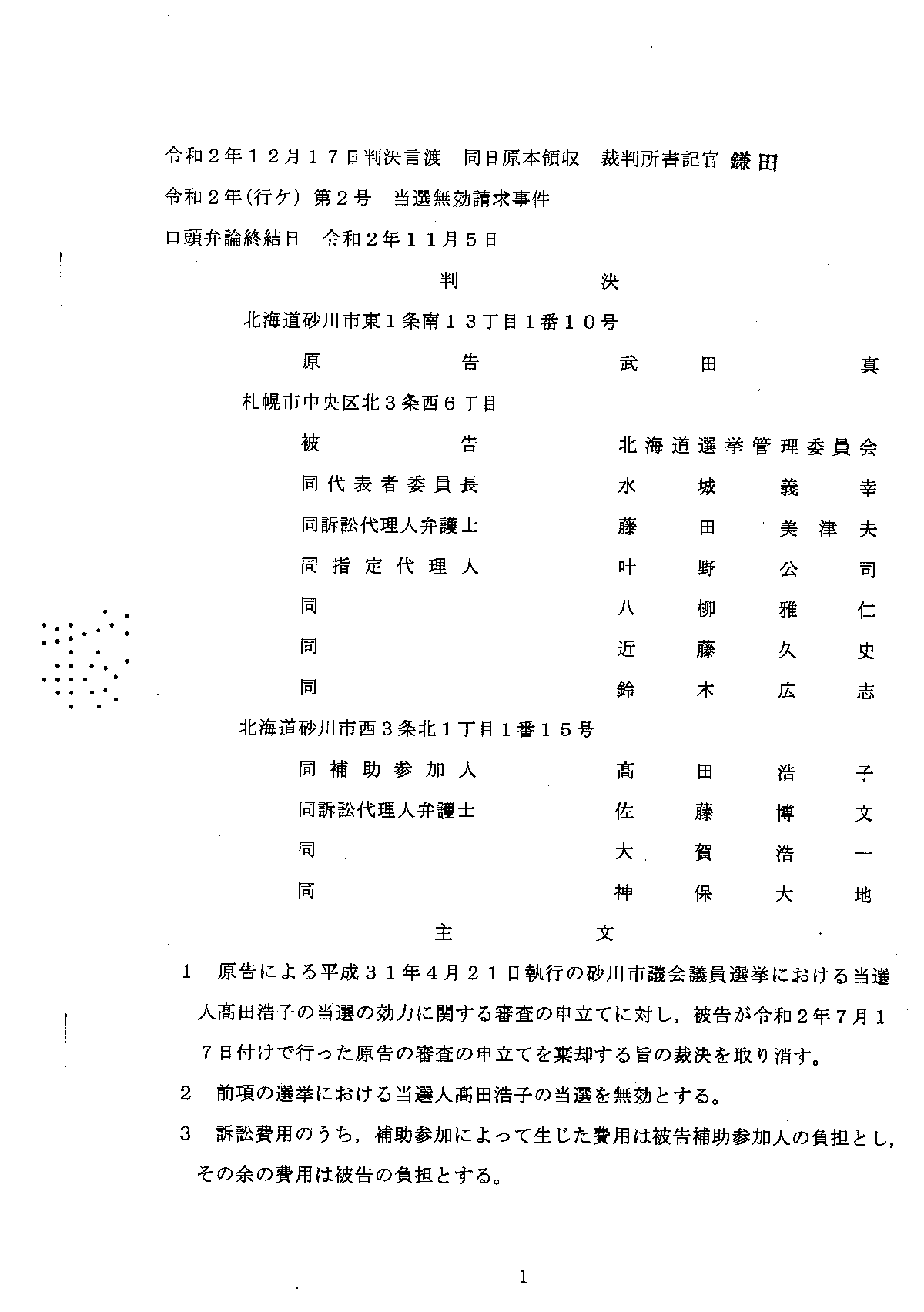 訴えていたのは、市議選に現職で立候補して落選した山口裕昭さん(55)。被選挙権について、公職選挙法は市町村議選では、その市町村に住所を3カ月以上持つことを要件としている。小松氏は2019年11月、妻と暮らす高畠町の住宅から母親が1人で住む南陽市の実家に住民票を移した。