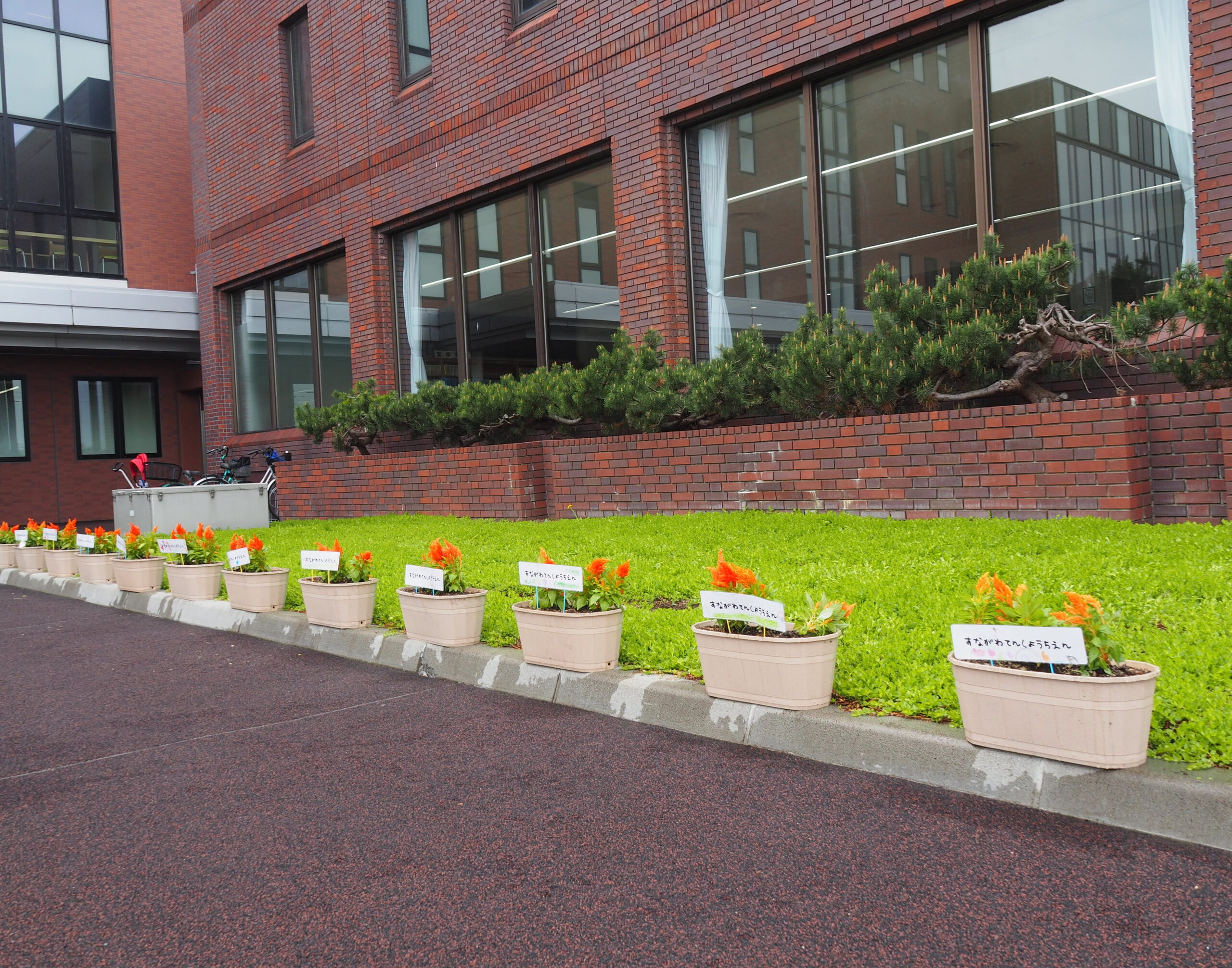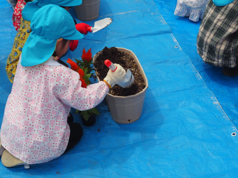 プランターに植えたのは、真っ赤で元気な色合いが特徴の鶏頭(けいとう)。子どもたちは声をかけながら、一生懸命に土を触り、丁寧にお花を植えてくれました。