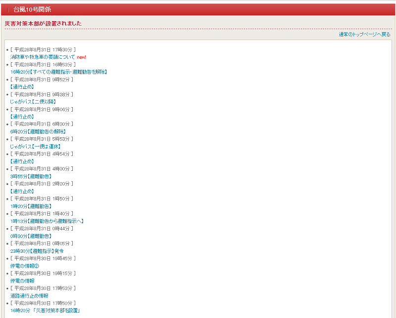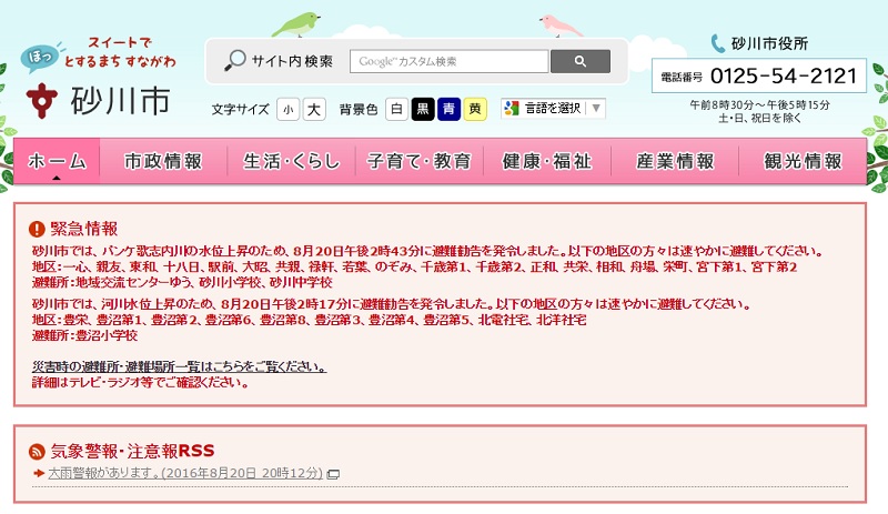 市のホームページにも緊急情報が載っています。また、災害時の緊急避難場所についても掲載されています。