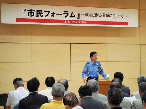 菊池警察署長の講演です。現在、飲酒運転については、「逮捕」を原則とした対応をしている旨説明がありました。6月6日の事故後、星元議員をはじめ、すでに、数人の逮捕者が出ています。