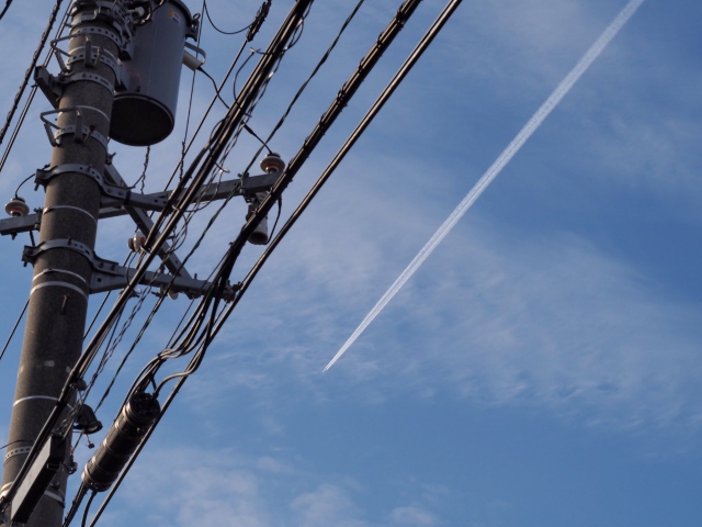 飛行機雲 投稿日時: 2015年11月7日 投稿者: 武田しん 市内のあちこちを歩いていましたが、今日は、どこからでも飛行機雲を見る事ができました。 なかなか消えない飛行機雲は、天候悪化の兆しとの言い伝えがあったかと思います。寒風に当たりすぎたせいか、おかしな咳が出てきたので、午後三時には今日の業務は終了です。宿題が増えてきたので、いろいろ考えていると頭痛も。皆様もご自愛ください。
