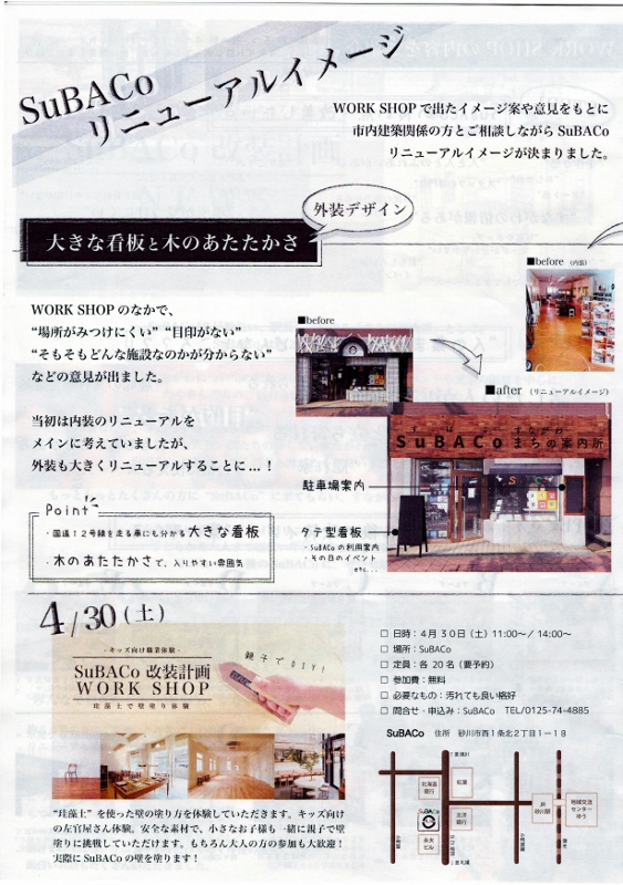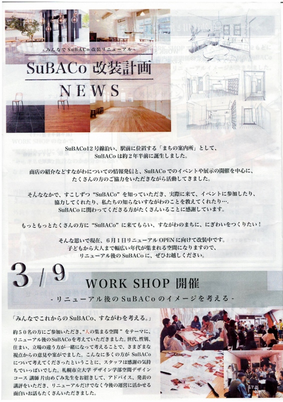 SuBACoについては、先日の委員会においても報告がありましたが、5月16日~31日まで改装のため休館となります。委員会の報告ではどのようなイメージかわかりませんでしたが、今日、チラシをもらい、イメージが理解できました。以前のおしゃれ感やアート感に満ちた場所も悪いとは言いませんが、いろいろな人が入りやすい場所になれば、いいですね。