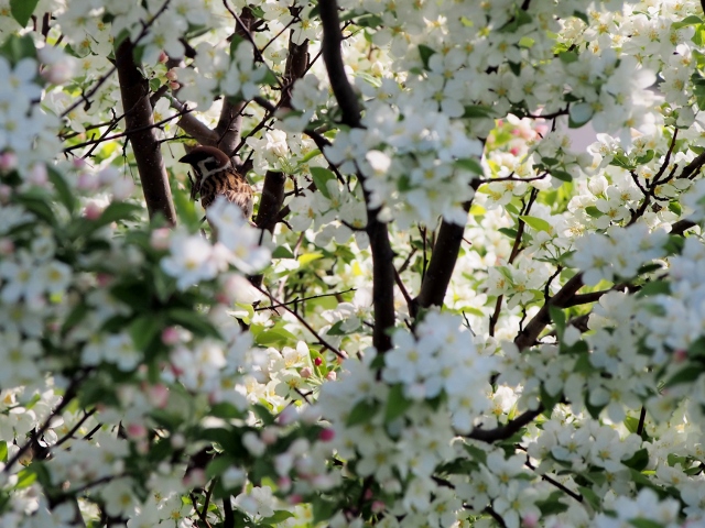 遊水地のエゾノコリンゴも咲き始めました。眺めているとスズメが飛び込んできました。