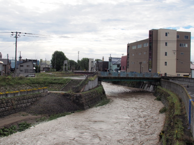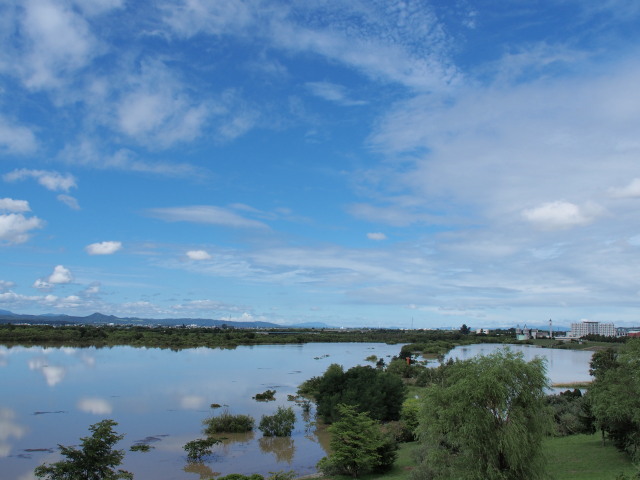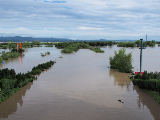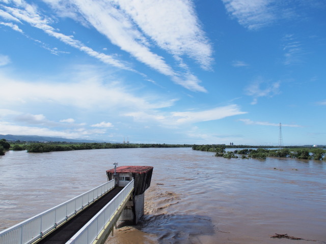 砂川大橋の中央から南を望みます。午前8時頃ですが、かなり水位が高いです。時々、大木が流れていきます。