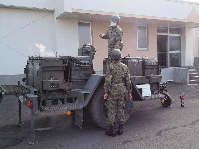 熊本にも出動した野外炊具1号(22改)です。最大約200人分の調理が可能であり、野菜調理器、かまど及びバーナー、自家発電機付きの高性能マシンです。今回はお米の炊き出しを行いました。
