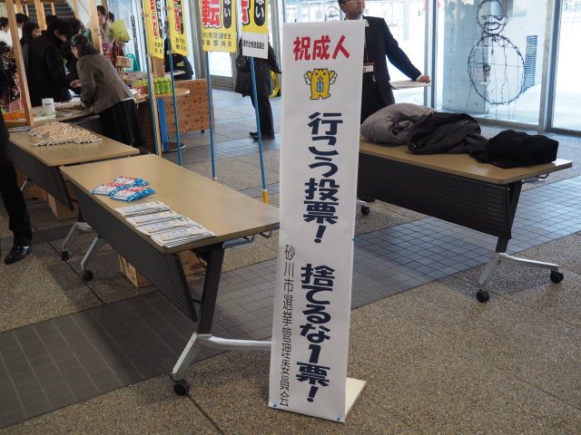 成人式出席 投稿日時: 2017年1月8日 投稿者: 武田しん 本日は「ゆう」で開催された成人式に来賓として出席しました。新成人のみなさん、ご家族の方、おめでとうございます。今後、大人として、様々な場所で活躍することを期待します。 砂川市の成人式は行政の後援等はありますが、基本は、新成人による「世話人会」が中心となり運営します。新成人は「お客さん」でなく、新たに大人の仲間入りをするという意味では運営に直接かかわるのは、よい方法だと思います。 世話人会の皆様 交流タイムでは恩師のビデオレターやビンゴ大会も ロビーでは砂川スィーツによる交流会もありました。 なお、今回の成人式の対象は平成8年4月2日から平成9年4月1日生まれの方でした。