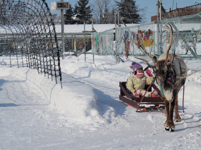 会場は「ゆう」の屋内と屋外の両方を使用しています。写真はトナカイのそり体験の様子です。背後の温度計はマイナス7度を示しています。