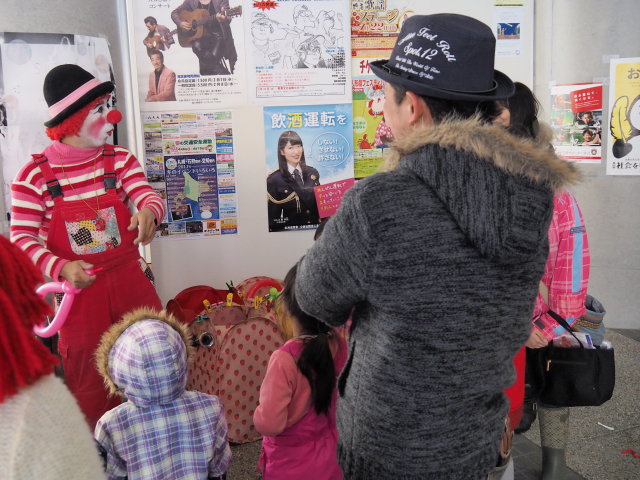 屋内での売店・屋台のコーナー。今年もピエロのぐっちさんのパフォーマンスがありました。