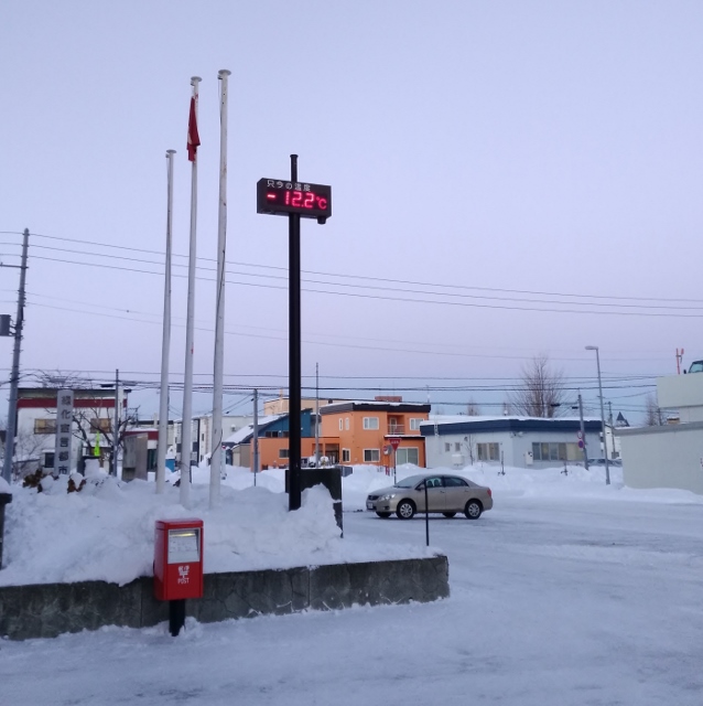 今冬一番の冷え込みだった24日。午後16時頃の市庁舎前の温度計はマイナス12.2度を指していますが、この日は1日中マイナス10度以下でした。なお、あいかわらず国旗と道旗は掲揚されていません。