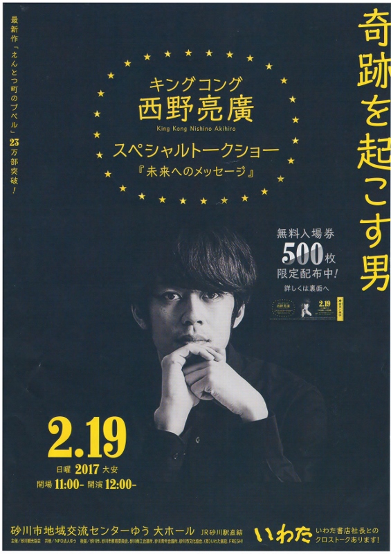 地域交流センターゆうにて開催された絵本作家としても有名なキングコング西野さんのトークショーに行ってきました。また、このトークショーは、一万円選書で有名な岩田書店の岩田徹氏との対談もあり、砂川市外からも多くの来場者を集め、盛大に開催されたところです。