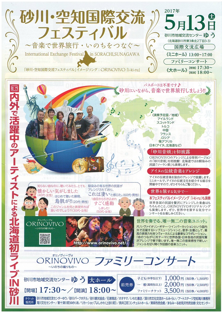 ファミリーコンサートは、北海道初上陸のORINOVIVOによるコンサートです。パスポートはいらない音楽の世界旅行と題してることもあり、世界各国の民謡をはじめ、ソーラン節やアイヌ伝統音楽をアレンジした音楽、さらには砂川音頭をアレンジした楽曲も披露され大変、好評でした。