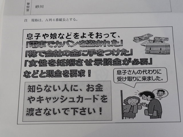 砂川署に許認可手続きの関係で出向いたところ、受領書に特殊詐欺の注意喚起が印刷されていました。聞けば、今年度は昨年度より被害が多いとのことです。