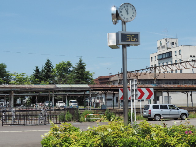 パフォーマンス会場の「ゆう」駐車場の近くにある温度計は午前11時で36度を差しています。北海道の気温とは思えません。