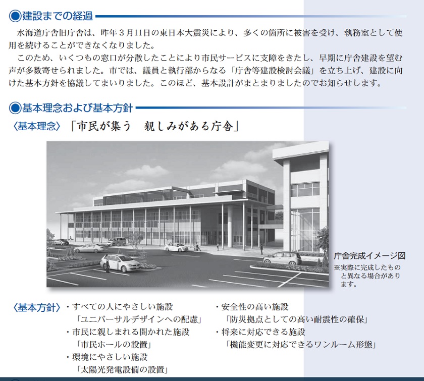 ・平成23年3月、東日本大震災により庁舎に多数の被害、同年6月、庁舎等建設検討委員会議(副市長、議員、部長)