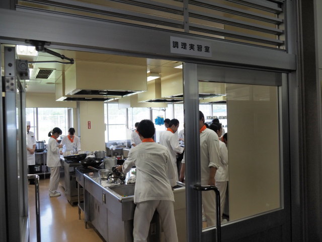 調理師コースの授業では、ホテル札幌ガーデンオアパレスの先生の指導を受け、中国料理の実習中でした。整然とならんだ調理器具が印象的でした。