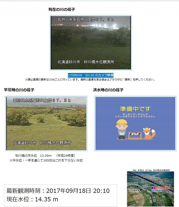 台風第18号は去っていきました。道内、市内でも突風等により若干の被害が生じたようです。こちらは18日20時10分現在の国土交通省の砂川橋の水位リアルタイム情報提供ページですが、特に問題はありません。今回は、朝方に市の広報車による災害対策本部を設置した旨のアナウンスがありました。昨年の事もあり、関係機関は緊張感を持って推移を見守ったものと理解します。