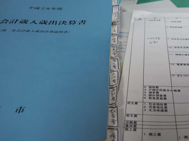 ともかく、今年も自分なりのテーマを設定し、さらには義務を履行すべく、準備して臨みました。月曜日は一般会計の歳出、議会費からはじまり、教育費で終わりました。火曜日は教育費のうち給食センター費からはじまり、歳入、最後に特別会計を審査しました。