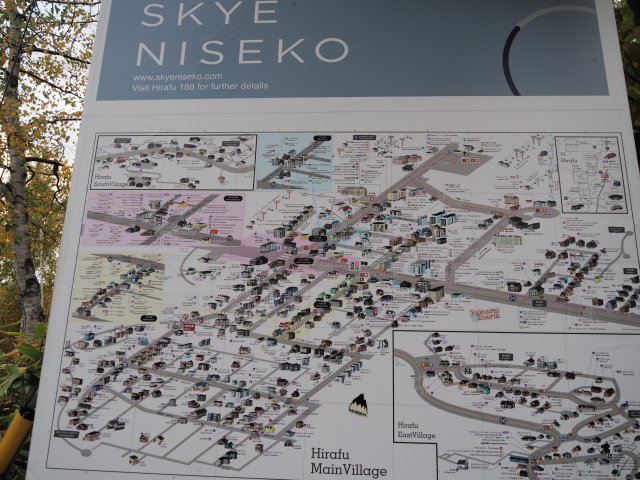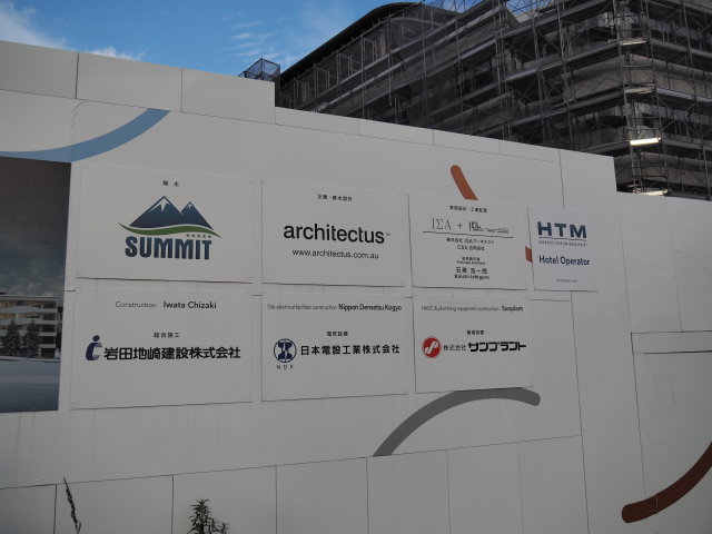 ヒラフ坂の頂上、ヒラフスキー場のすぐ側に建設中のマンション型の別荘コンドミニアム。建設は日本のゼネコンですが、企画は外国資本です。看板の英語の説明文を斜め読みすると投資物件としての意味もある施設ではないかと想像しました。