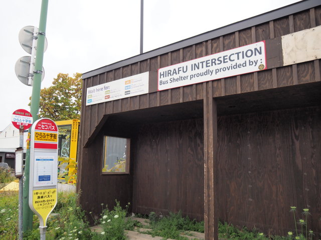 バス停は英語の表記の方が多い気がします。日本語と英語の公共サインがまざり、カオスです。シーズンオフですので観光客は見当たりません。