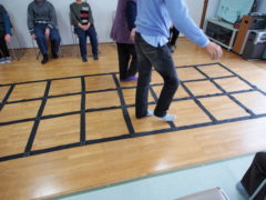 マス目を利用したステップがたくさん用意されており、このステップを間違えないように「学習」しながら歩行のバランスを改善する「運動学習プログラム」です。集団で交差して歩くこともできるので、レクレーションとしても楽しむことができます。」以上パンフからの引用です。