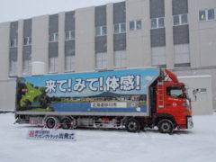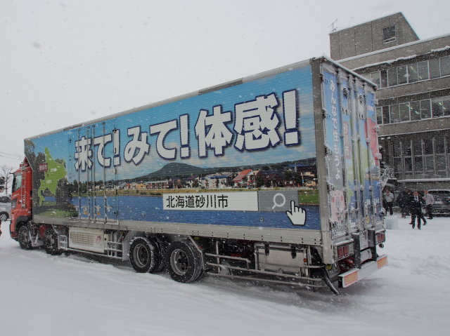 砂川市PRラッピングトラック出発式 投稿日時: 2017年12月1日 投稿者: 武田しん 岩見沢市では大雪が降り、道央道が通行止めになった雪の日でした。本日は砂川市をPRするラッピングトラックの出発式が市庁舎前で開催されました。ラッピングトラックを作成したのは丸一運輸株式会社さんです。道内だけではなく、道外にもトラックとともに情報が発信されることになります。 みまもりんごにポークチャックリンも 風景は夏の北光公園です。トラックを見た方に、是非、砂川を「来て!みて!体感!」していただきたいです。 交通安全に気をつけていってらっしゃいませ。