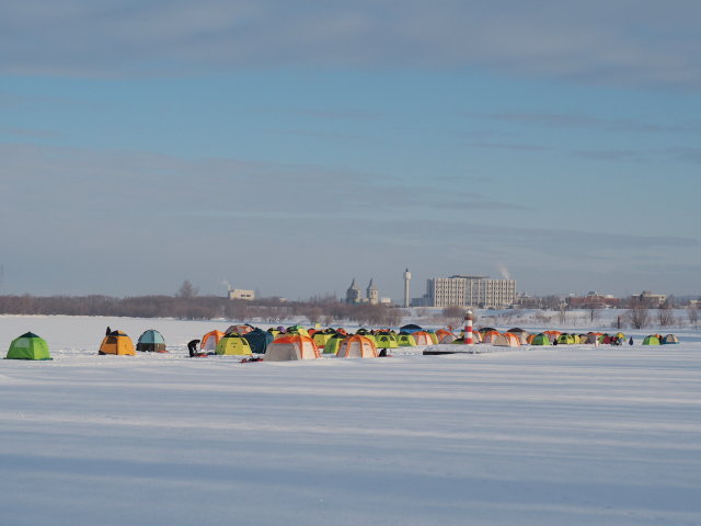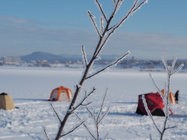 遊水地は早朝からワカサギ釣りで賑わっていました。樹氷も見える厳寒の朝です。