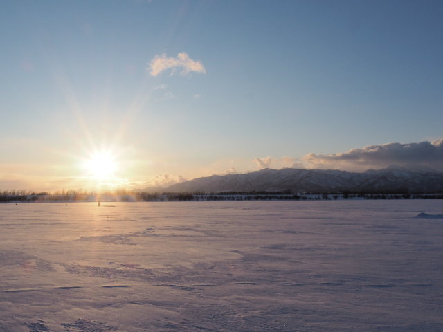 夕方、遊水地管理棟に立ち寄ったところ、社会実験の案内看板がありました。27日(土)は自分で釣ったワカサギを1gにつき1円で天ぷらに調理するという内容です。