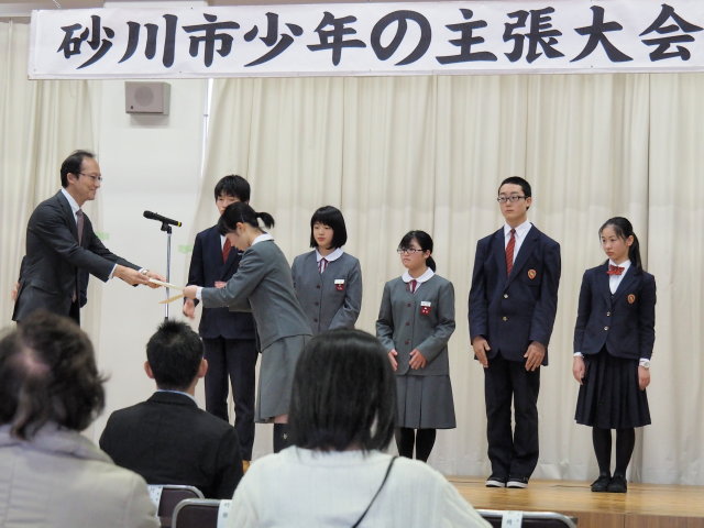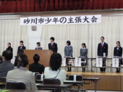 平成29年度砂川市少年の主張大会 投稿日時: 2018年2月10日 投稿者: 武田しん 午前10時30分から公民館で少年の主張大会が開催されました。石山、砂川中学校、そして今年は小学生の計8名の参加がありました。会場の4階大会議室は、市民、教育関係者などの約70名の出席があり、満員となりました。 発表時間は一人5分程度となっています。内容は、「コミュニケーションの課題」、「自分の病気と向きあった経験」、「いじめ」、「家族」など、どの主張もすばらしいものでした。優秀賞の1名は7月の空知地区大会に出場することになります。