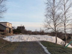 午後から、自転車で市政報告の配布に出かけていましたが、遊水地の天端では、このように未だに排雪された雪が一部に残り、とても不便です。