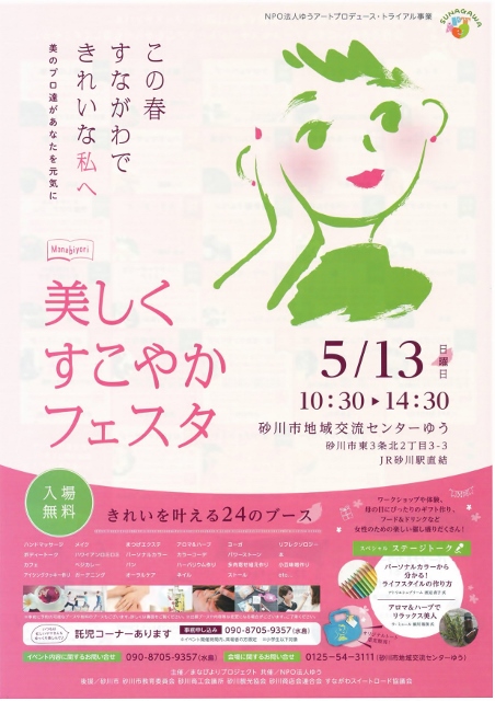 母の日に「ゆう」で開催された、まなびよりプロジェクト主催の「美しくすこやかフェスタ」を取材してきました。今回がはじめてのイベントとなります。内容は観光協会のホームページから引用すると「女性のための楽しいイベント。きれいを叶える24のブースで皆様をお待ちしております。」となっています。