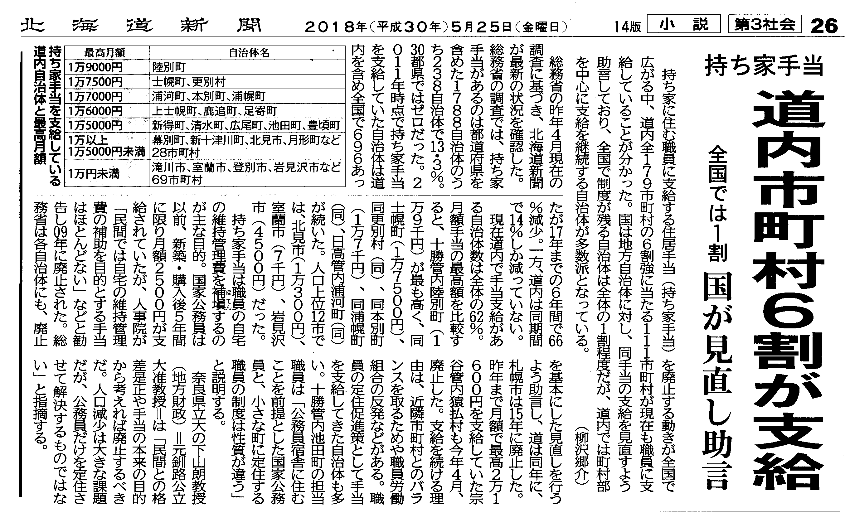 また、かねてより私が廃止すべきと指摘している「持ち家手当」については、道内の6割の自治体において、支給されている状況が報道されました。この持ち家手当は平成21年に人事院勧告に基づき、国家公務員では廃止、北海道庁においても廃止されています。