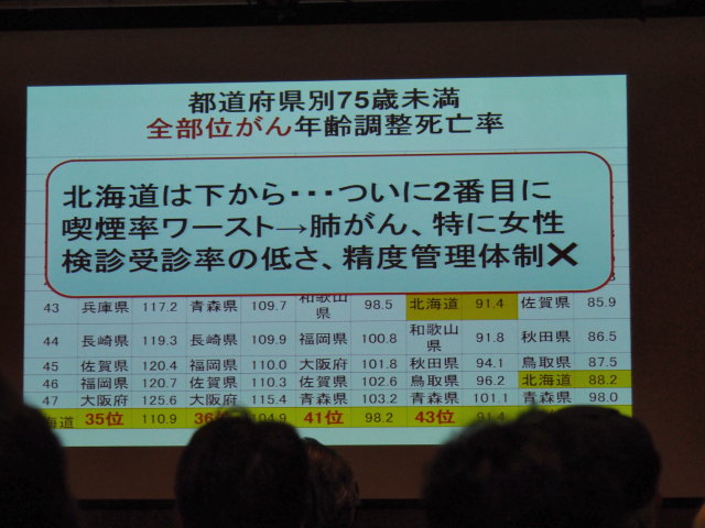 両先生が共通して強調していたのは「がん検診に行こう」ということだったかと思います。乳がん検診では全国平均の検診受診が26%に対し、砂川市では10.4%という結果になっています。