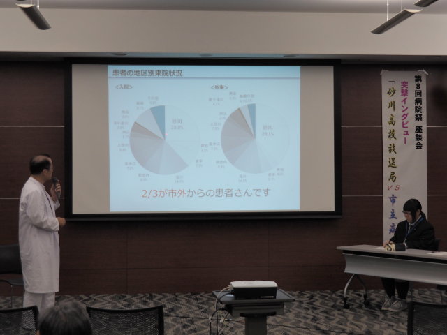 第8回を迎えた病院祭です。今年の目玉は砂川高校放送局が、事業管理者、院長、看護部長、事務局長に直撃インタビューをするコーナーです。なお、インタビューは事前通告なしのぶっつけ本番で行われました。