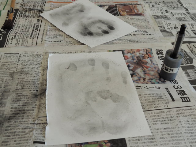 本職の警察官の指導のもと鑑識体験で指紋をとってみました。被疑者にはなりたくないものです。