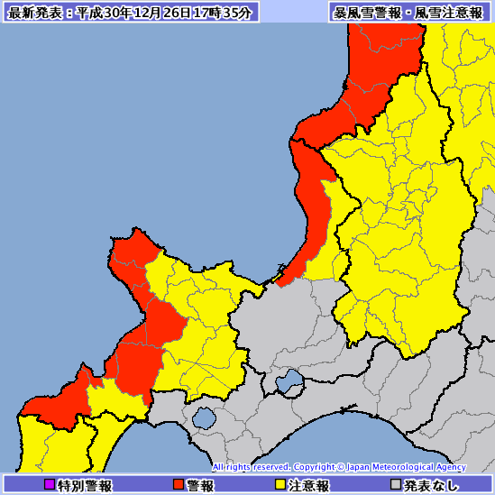 警報級寒波到来 投稿日時: 2018年12月26日 投稿者: 武田しん 石狩地方では27日明け方まで、後志地方では26日夜のはじめ頃から27日明け方まで、暴風雪に警戒してください。(気象庁ホームページより) 午前中は市立病院の外来の診療に出かけていました。さすがに10kg以上の荷物を持って山を歩くようなハードな運動はしばらく自粛ですが、除雪作業等の日常生活は問題ありません。午後から、打ち合わせのため自動車で出かけましたが、できれば運転したくない天候の一日でした。