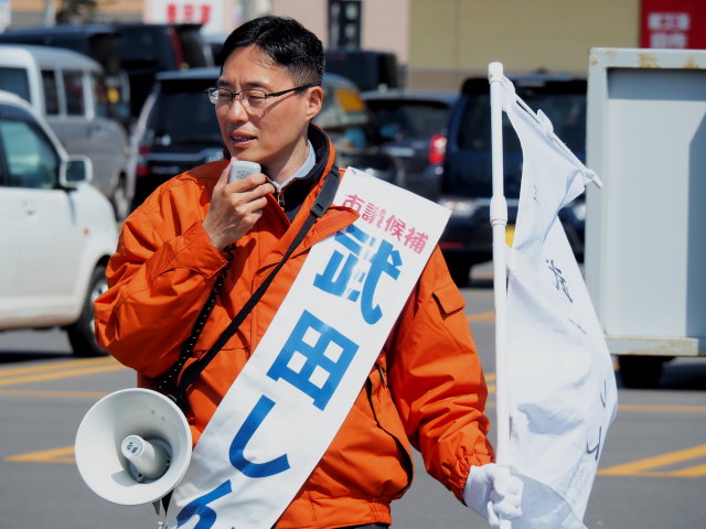 選挙戦六日目 投稿日時: 2019年4月19日 投稿者: 武田しん 本日、誕生日を迎え48才になりました。選挙期間中に誕生日を迎える事例はあまりないと思います。なお、選挙公報等の年齢表示は投票日が基準となるので、48才の表示で選挙公報の原稿を提出しています。 本日は早朝から冷たい雨が降りました。午後から晴れましたが、風が冷たい一日でした。風は冷たくとも今日も熱く市内を駆けまわりました。 街頭演説中に駆けよって来てくれた方もいました。感動しました。本当にありがとうございました。