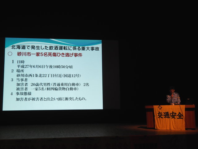集会では、砂川市交通安全推進委員会の会長である飯澤市長が挨拶を行いました。市長は飲酒運転の撲滅を目指す決意を述べました。また、滝川警察署交通課長も交通安全講話を行い、飲酒運転の危険性や厳罰化の経過等について説明しました。