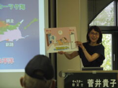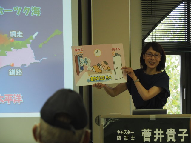 イベントは気象予報士の菅井貴子さんによる防災講演から始まりました。最近は北海道でも寝苦しい日々ですが、扇風機により室内の空気を外へ流す方法については冗談のようですが効果がありそうです。
