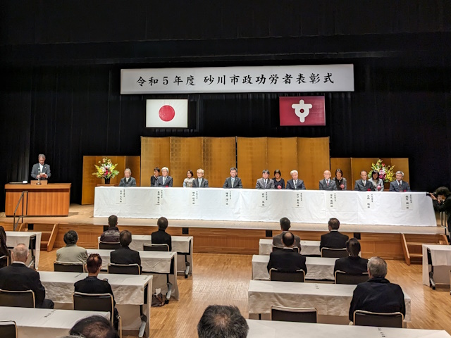 11月3日、地域交流センター「ゆう」で行われた「砂川市政功労者表彰式」に出席しました。この表彰式は、市政の振興・発展に功績のあった方々を表彰する素晴らしい機会で、今年度は特別功労表彰1名、市政功労表彰7名、貢献表彰1名の方々が表彰されました。市政の発展に尽力された皆様、おめでとうございます。市民の皆様の貢献が砂川市をより良い場所にしています。